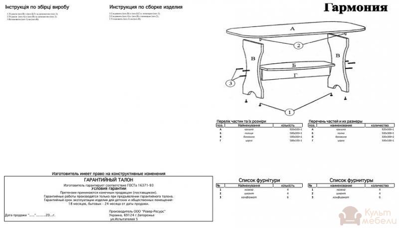 Журнальний столик поставляється у фабричній упаковці (у розібраному вигляді) з детальною інструкцією по збірці. Варіанти кольорових рішень представлені нижче.