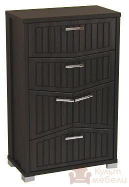 Комод складається з трьох ящиків різної форми, які закріплені на напрямляючих телескопічного типу а також є дві дверки над нижнім ящиком. Модель досить містка і зручна, має подовжену форму і представлена в декількох відтінках.