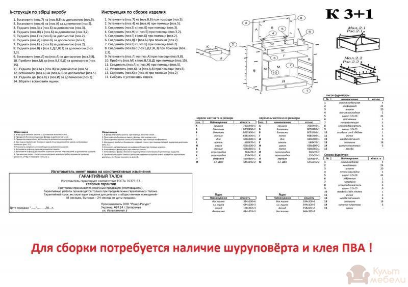 Комод Пехотин К - 3/1 з ламінованого ДСП, товщиною - 16 мм, при кромкуванні якого застосовується ПВХ, товщиною - 0,5 мм і 2 мм. Усі меблі цієї фабрики поставляються у фабричній упаковці (у розібраному вигляді) з детальною інструкцією по збірці товару.