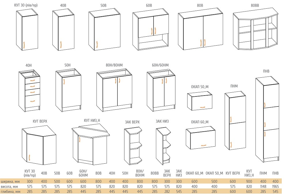 На фото представлена кухня с модулями: верх (40В,60В,80ВВ,80В ) низ (40Н,60Н,80Н,80НМ)