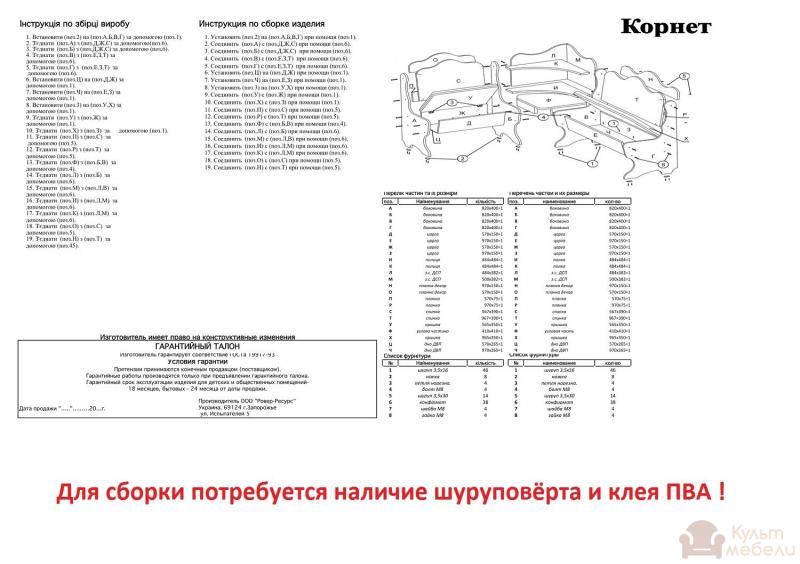 Кухонний куточок Пехотин Корнет з ламінованого ДСП, товщиною - 16 мм, при кромкуванні якого застосовується ПВХ, товщиною - 0,5 мм і 2 мм. Усі меблі цієї фабрики поставляються у фабричній упаковці (у розібраному вигляді) з детальною інструкцією по збірці товару.