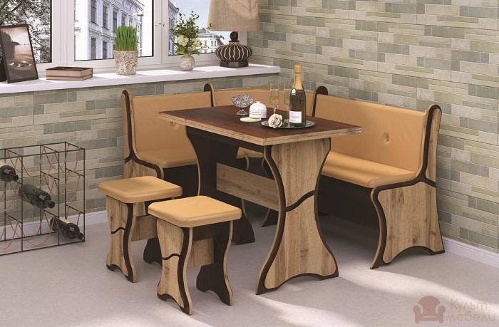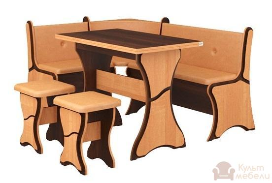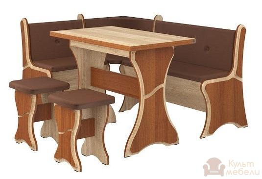 У комплект кухонного куточка входить розкладний стіл і 2 табурети, варіанти оббивки : тканина, шкір. замінник а їх кольорові рішення представлені нижче. Також є можливість купити окремо: стіл, табурети і сам куточок.