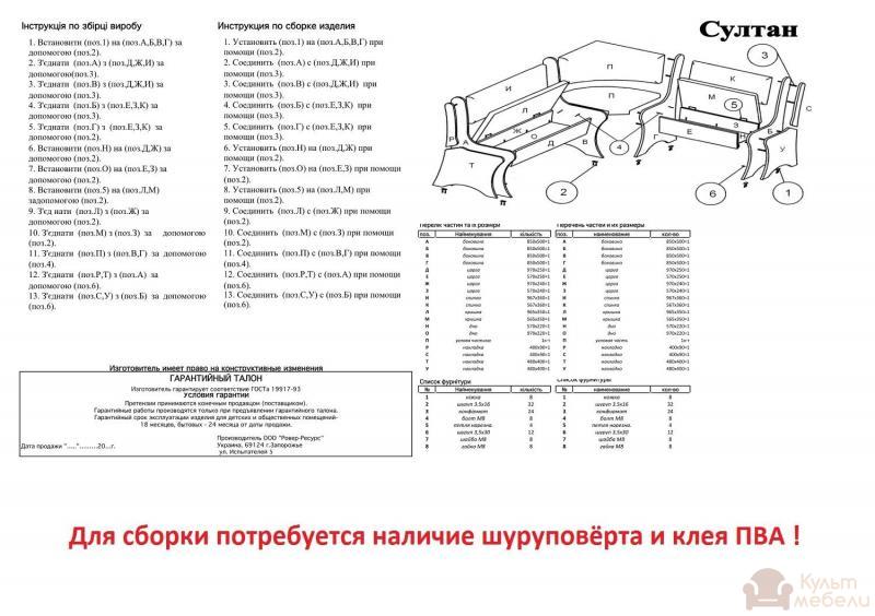Кухонний куточок Пехотин Султан з ламінованого ДСП "Swisspan", товщиною - 16 мм. При кромкуванні використовується ПВХ, товщиною - 0,5 мм. Кухонний куточок поставляється у фабричній упаковці (у розібраному вигляді) з детальною інструкцією по збірці.