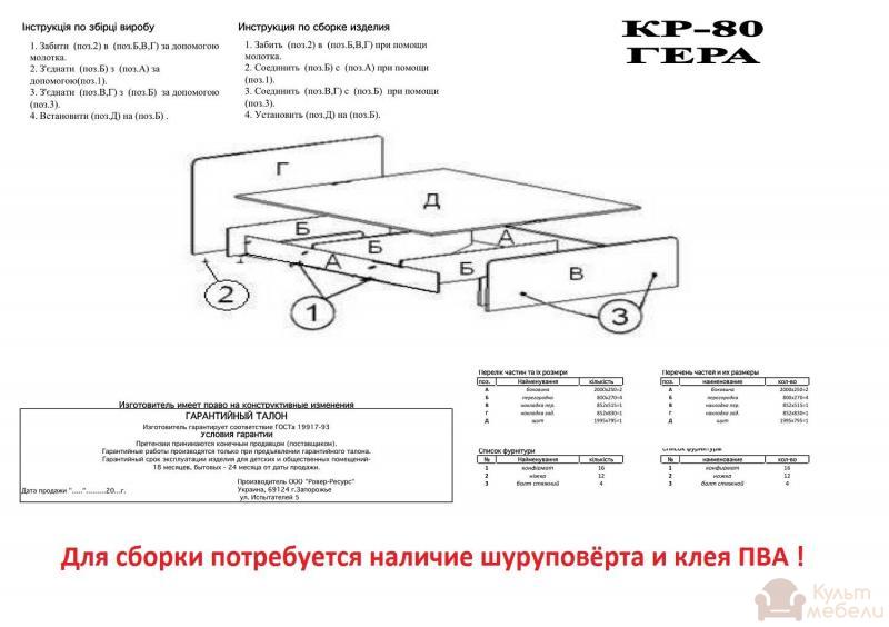Ліжко Пехотин Гера - 80 з ламінованого ДСП і МДФ, товщиною - 16 мм. При кромкуванні, використовується ПВХ, товщиною - 0,5 мм і 2 мм. Застосовується якісна фурнітура.