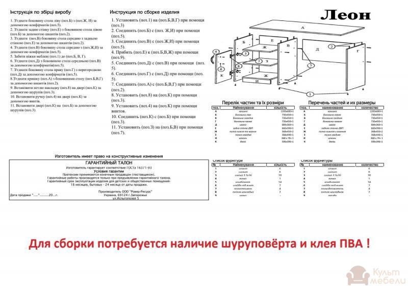 Письмовий стіл поставляється у фабричній упаковці (у розібраному вигляді) з детальною інструкцією по збірці. Серія письмових столів Пехотин забезпечена якісними кріпленнями і надійною стільницею.