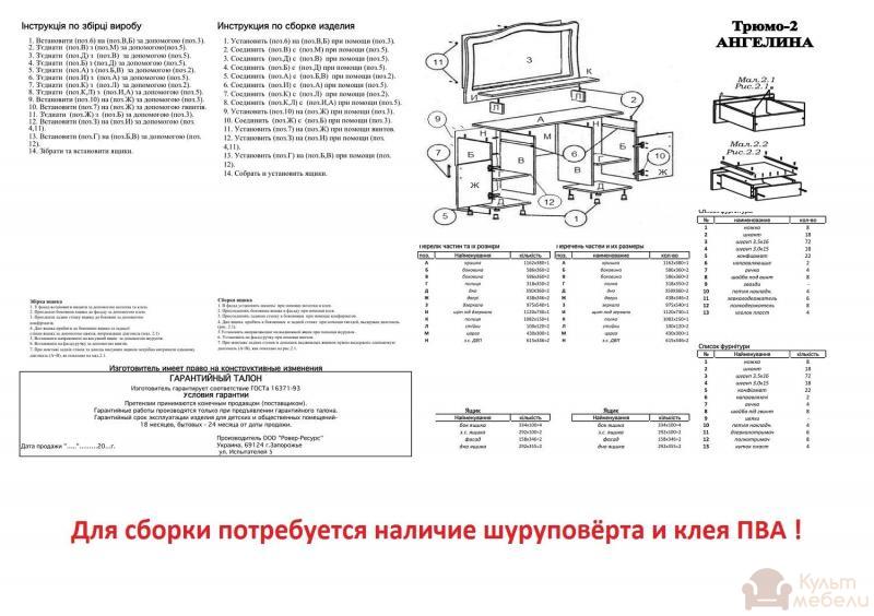 Туалетний столик Пехотин Ангеліна трюмо - 2 з ламінованого ДСП і МДФ "Swisspan", товщиною - 16 мм. При кромкуванні, використовується ПВХ, товщиною - 0,5 мм і 2 мм. Застосовується якісна фурнітура і роликові направляючі для висувних ящиків.